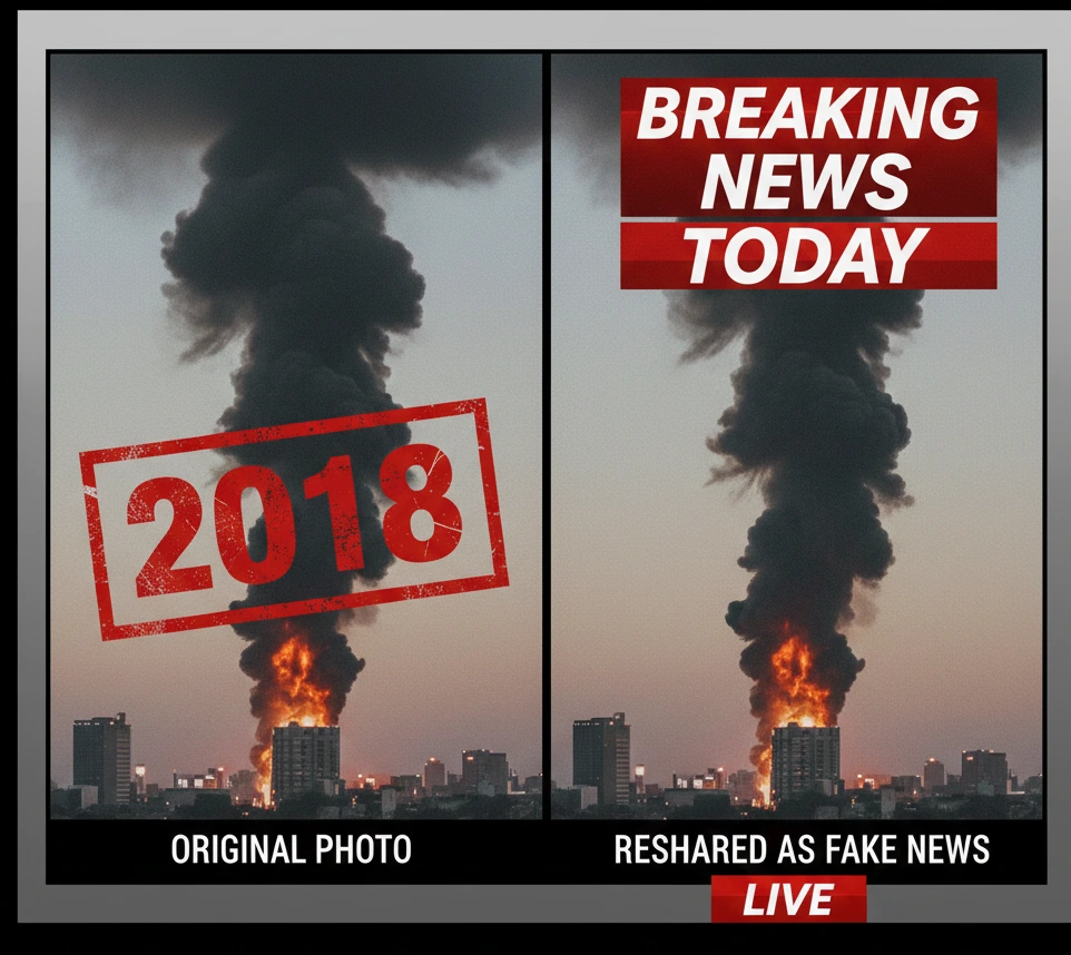 Not all fake images are digitally altered. Some are real photos used in the wrong context. Old disaster images reappear during new crises. Photos from one country are claimed to be from another.