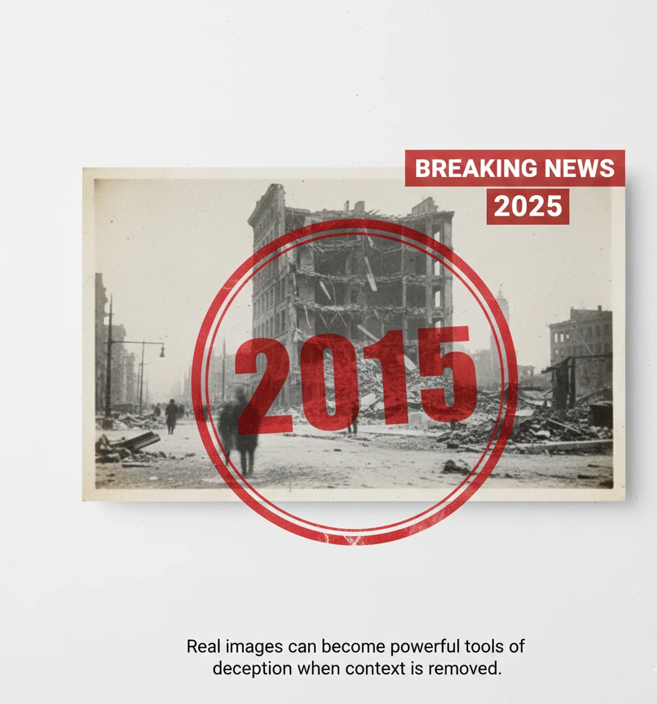 False context occurs when genuine content is reshaped to tell a different story. Old images are reposted as if they are recent, or unrelated photos are linked to current events.